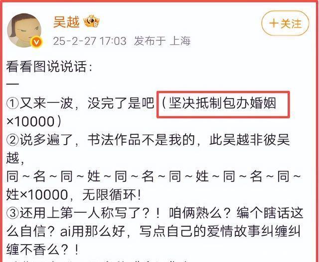 八瓜鱼 编辑| 八瓜鱼 “坚决抵制包办婚姻×10000” 2025月,吴越在社交平台用这句幽默又坚定的话,辟谣了与赵文瑄的结婚传闻。 彼时,内娱正被各式真假难辨的明星绯闻刷屏。 她的干脆利落让不少网友感叹“果然是吴越的风格”。